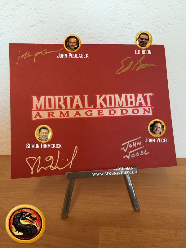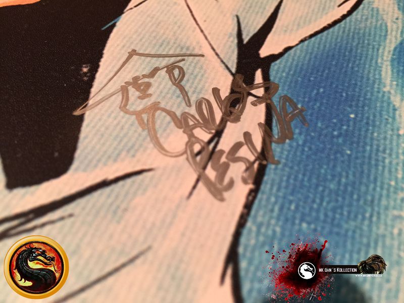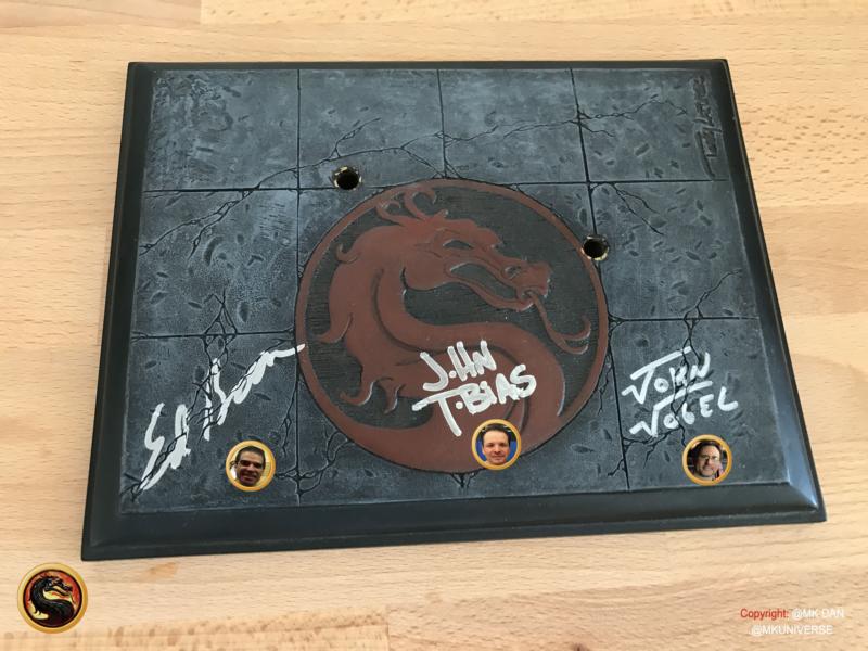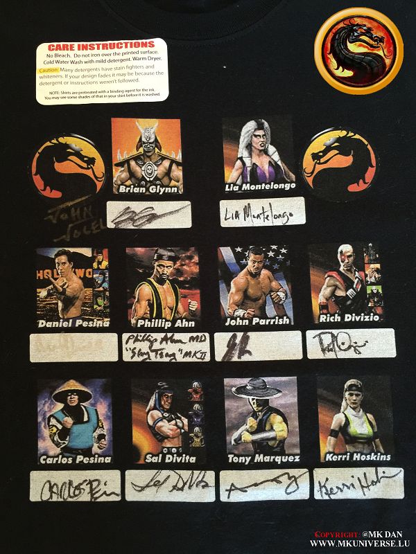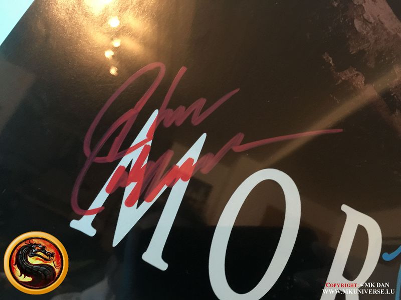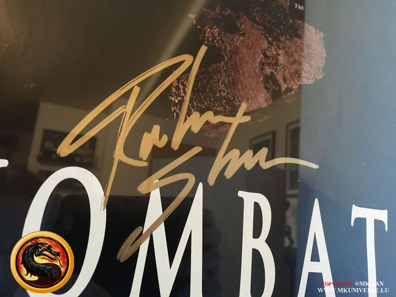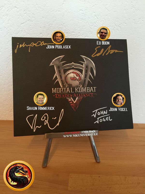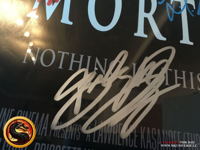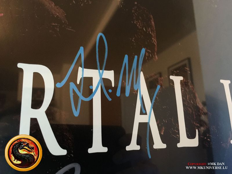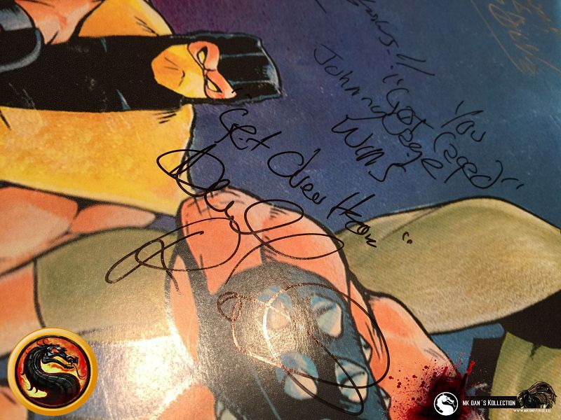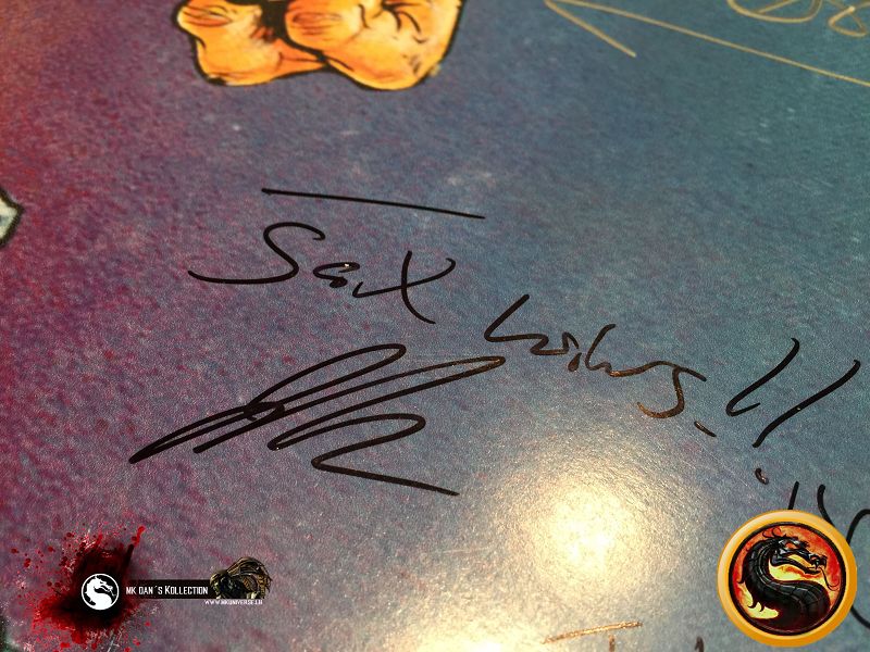 Signiert von: Elisabeth Malecki (Sonya MK1), Daniel Pesina (Johnny Cage MK2), Ho Sung Pak (Liu Kang MK1), Carlos Pesina (Raiden MK2).