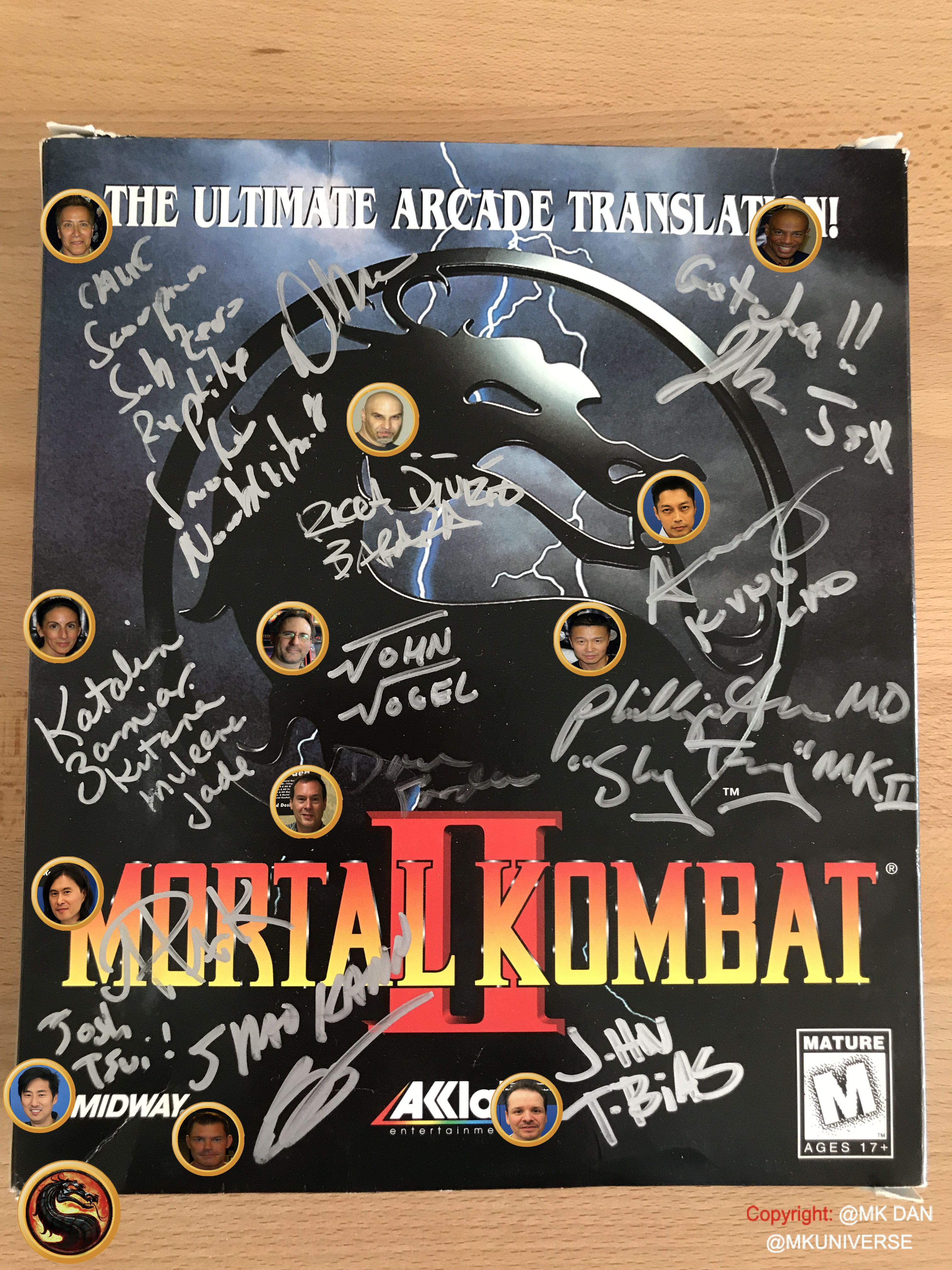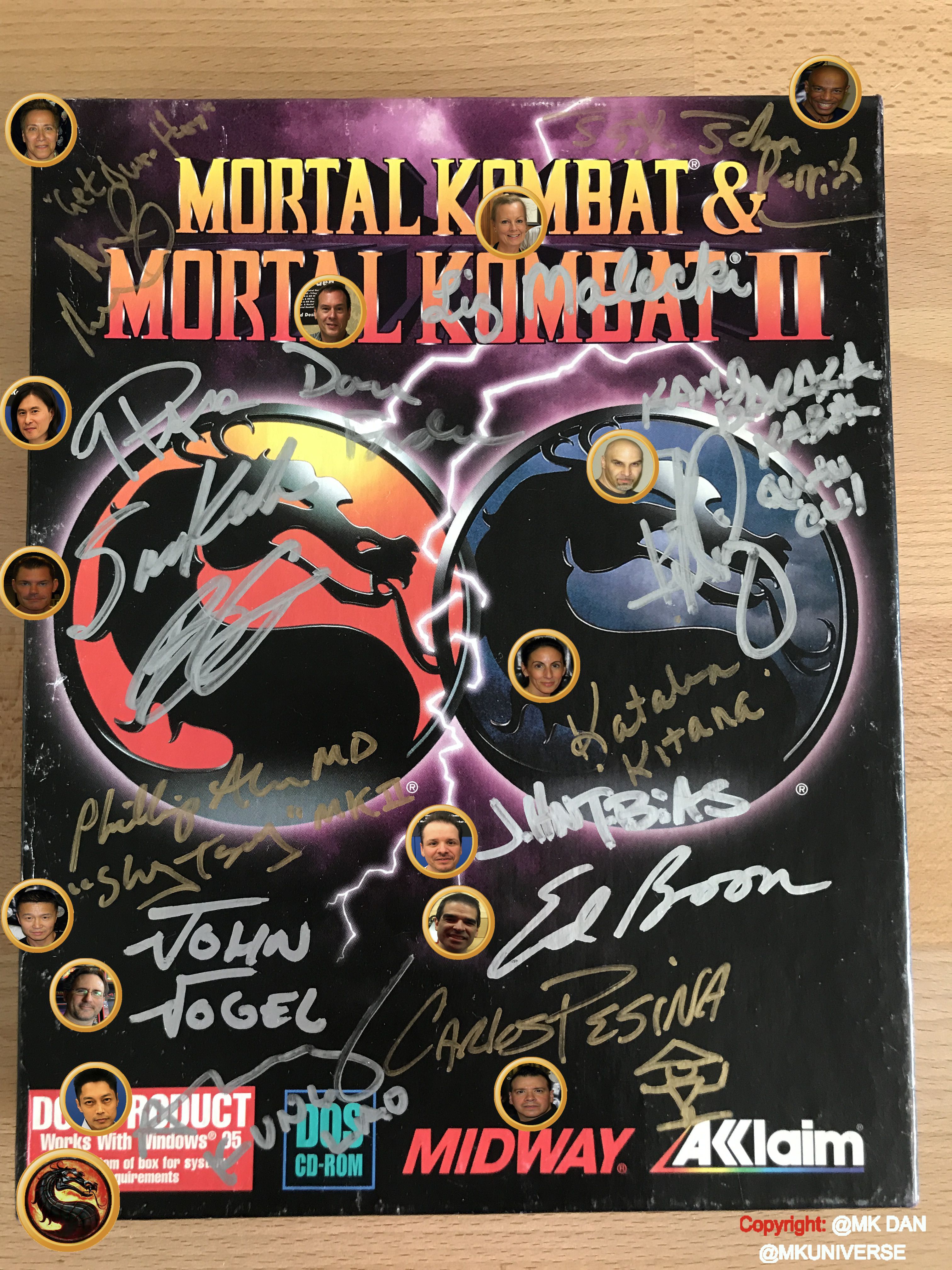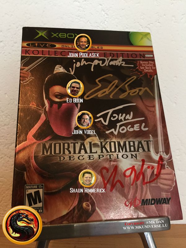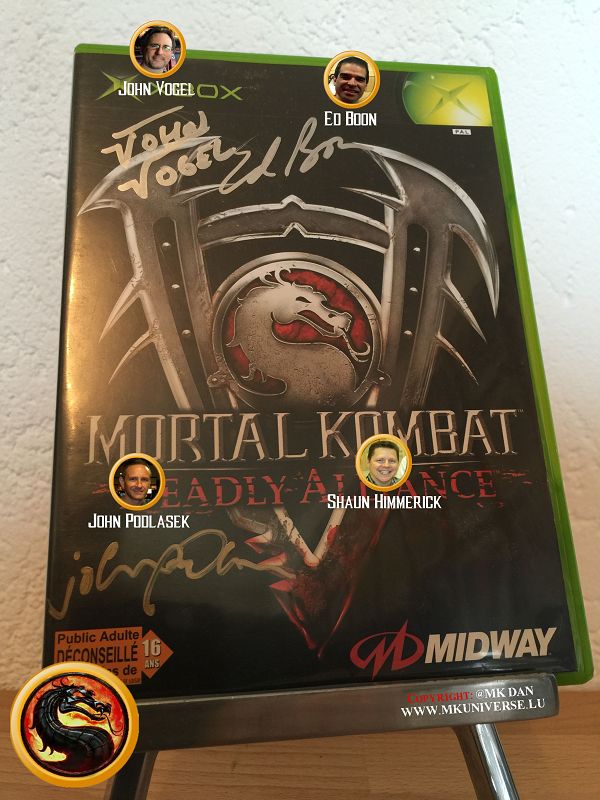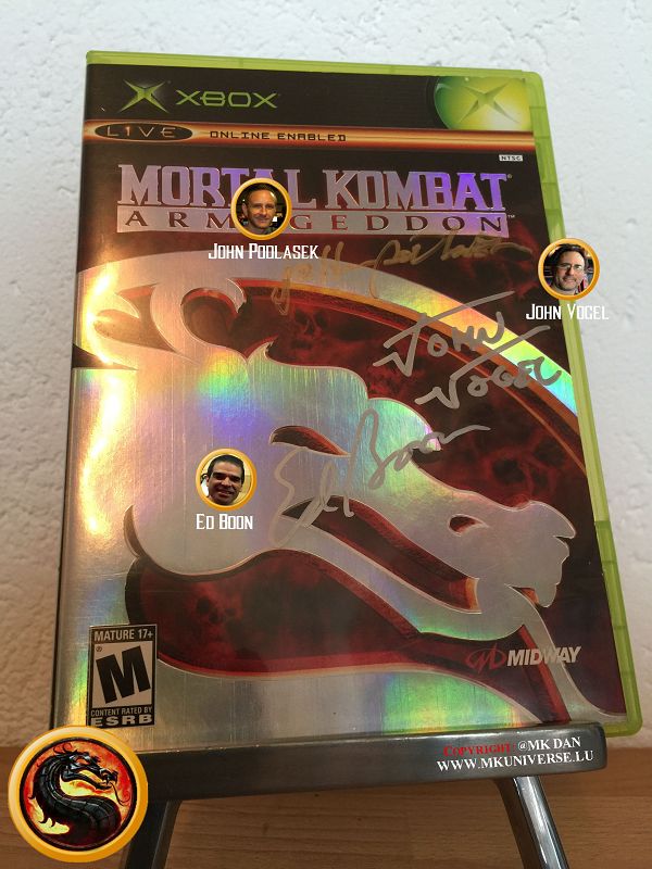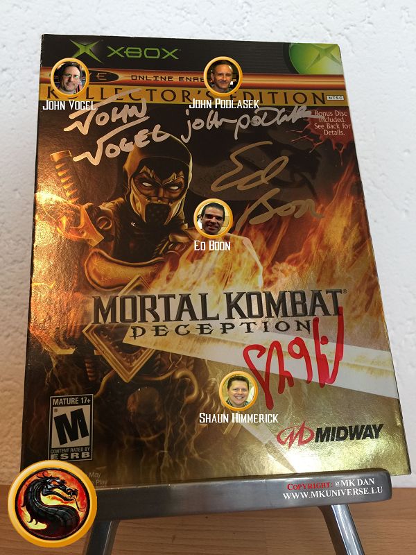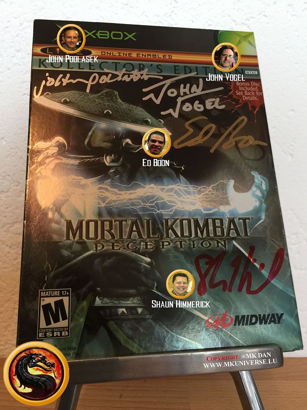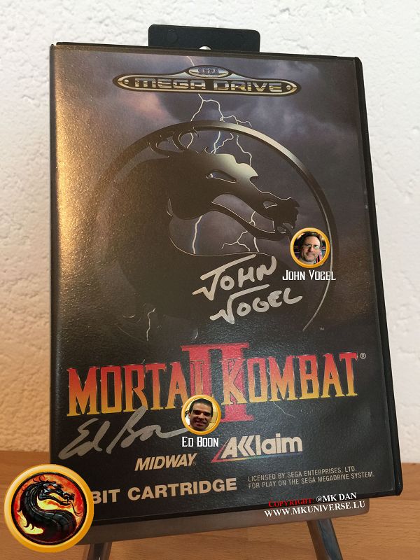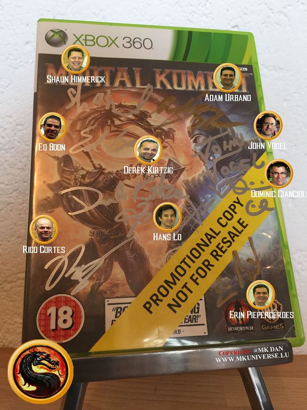 " MK & MK II ist "signiert" von: Ed Boon, John Tobias, John Vogel, Dan Forden, Carlos & Daniel Pesina, Richchard Divizio, Philip Ahn, John Parrish, Katalin Zamiar, Anthony Marquez, Brian Glynn, Ho-Sung Pak und Elisabeth Malecki."